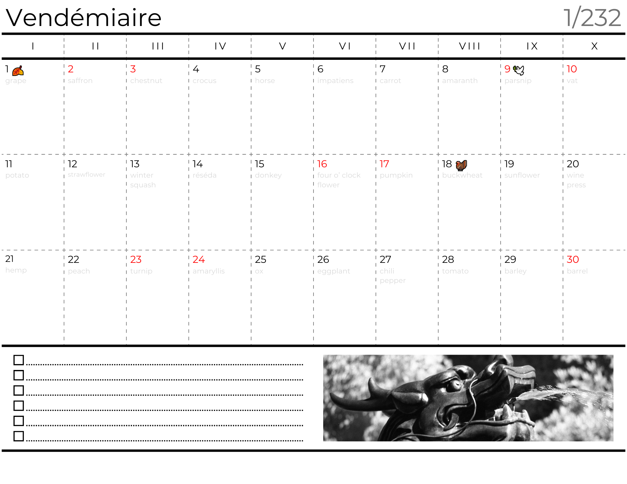 For those unfamiliar, The French Republican Calendar, also known as the Revolutionary Calendar, was introduced in France during the French Revolution on October 24, 1793, and was used until January 1, 1806. It aimed to de-Christianize the calendar by removing religious and royalist influences, marking its introduction as Year I. The calendar was structured into 12 months of 30 days, divided into three 10-day weeks called ‘décades’. To keep in line with the solar year, extra days termed ‘sansculottides’ were added annually.
